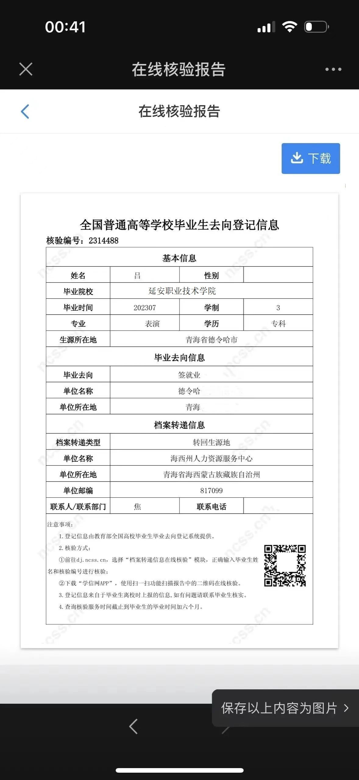 注:去向登记信息核验报告主要包括核验编号、核验二维码、基本信息、毕业去向信息、档案转递信息等。