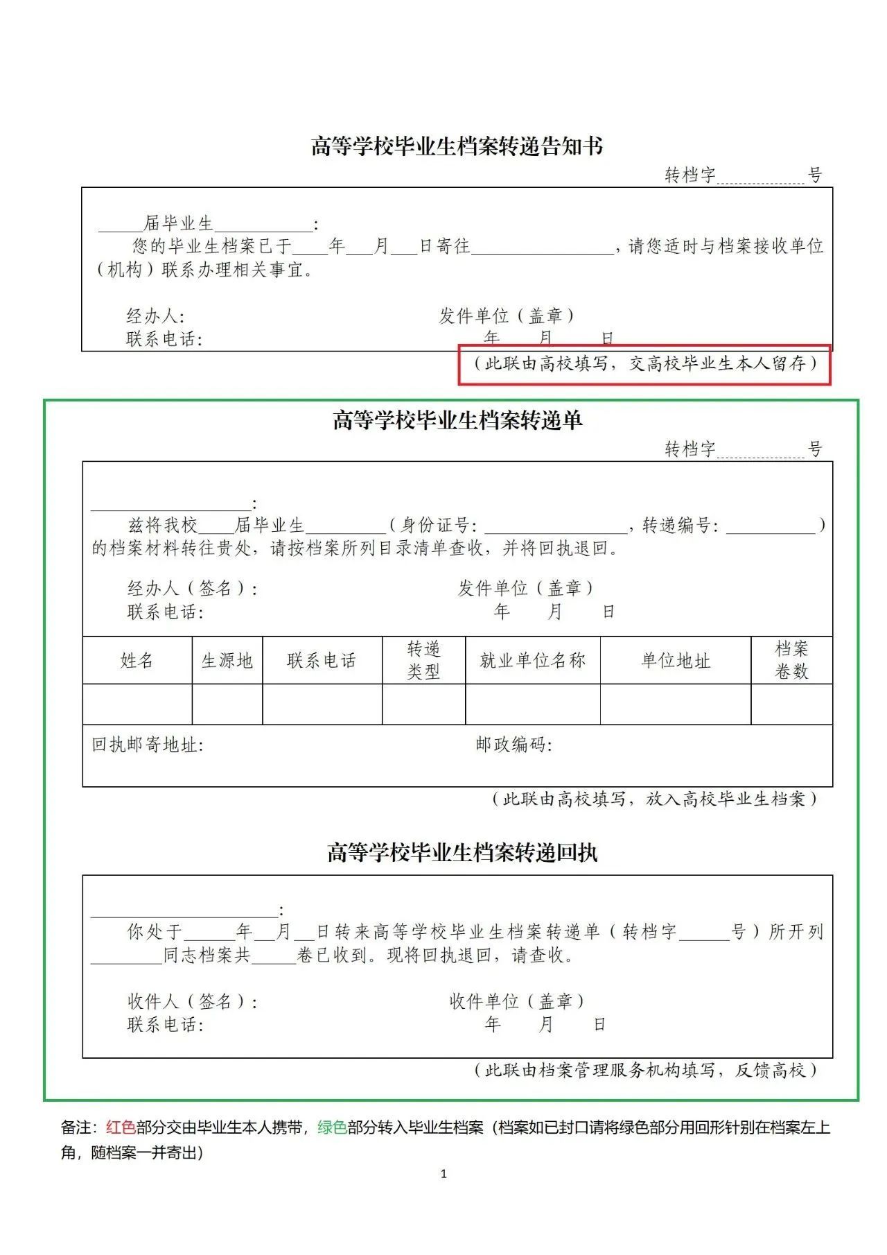(毕业生提交后,辅导员老师填写转递单,红色部分交由毕业生本人携带,“绿色”部分装入毕业生档案)